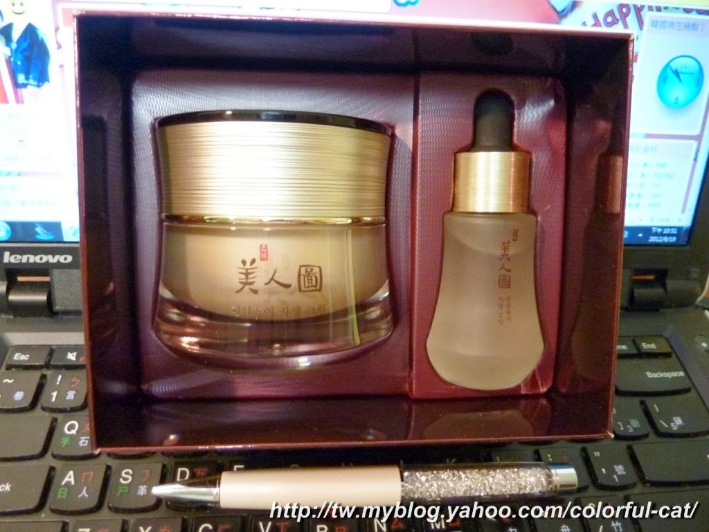 禮盒組包含50ml的 金色美人圖 "天蔘松茸精華面霜"(容量挺多的~),以及32ml的天蔘松茸精華油(分子很細很好吸收,擦在較乾的部位,例如法令紋~)。